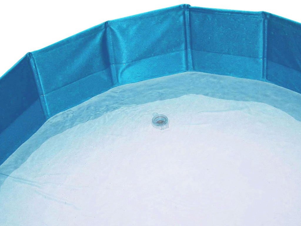 Skládací bazén pro psy, z odolného plastového materiálu, montáž/demontáž bez čerpadla, praktická výpusť na dně bazénu, strukturované dno proti uklouznutí, stabilní vyztužené boční stěny, rozměry Ø80x20 cm.