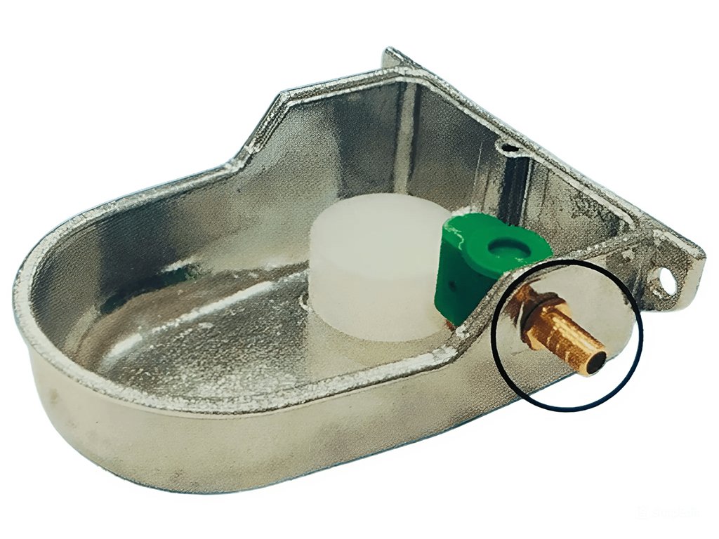 Hladinová napáječka pro malá zvířata, udržuje konstantní hladinu, pro připojení k nádrži, vyrobeno z hliníku, kapacita 0,4 l, rozměry 14,5x16x6 cm.