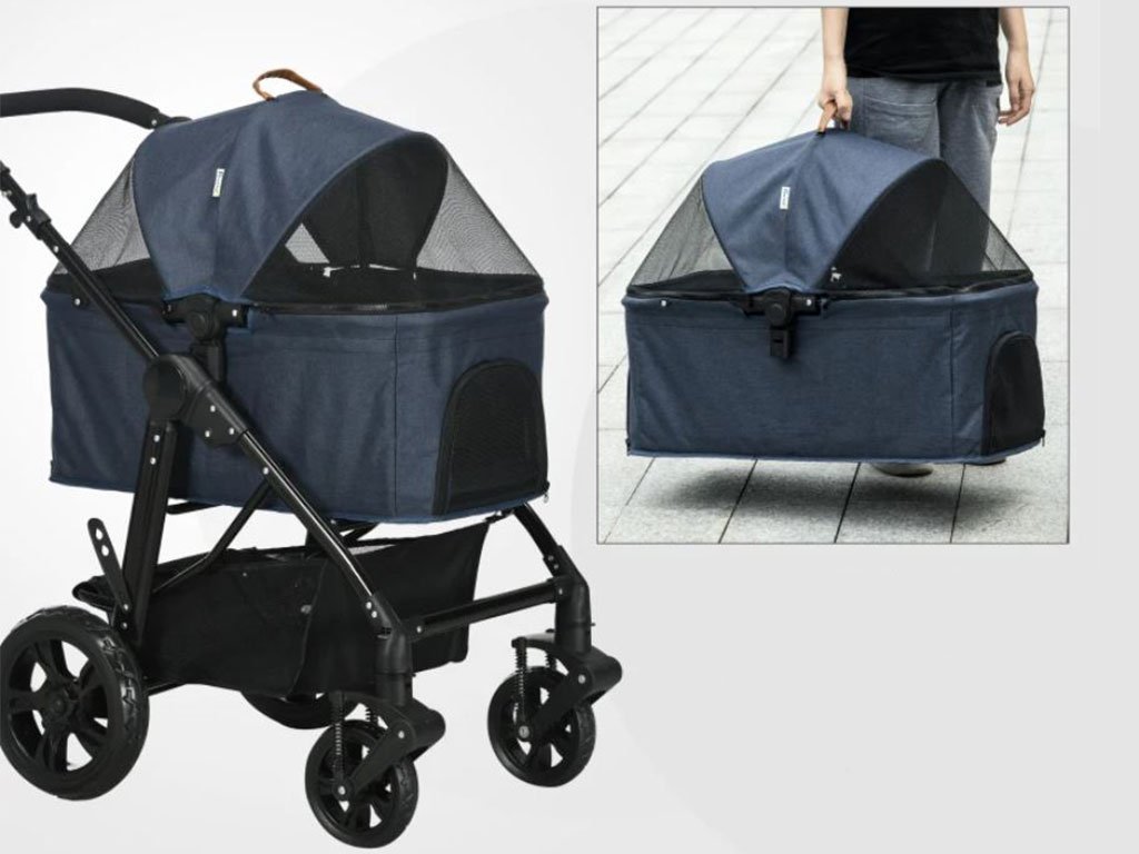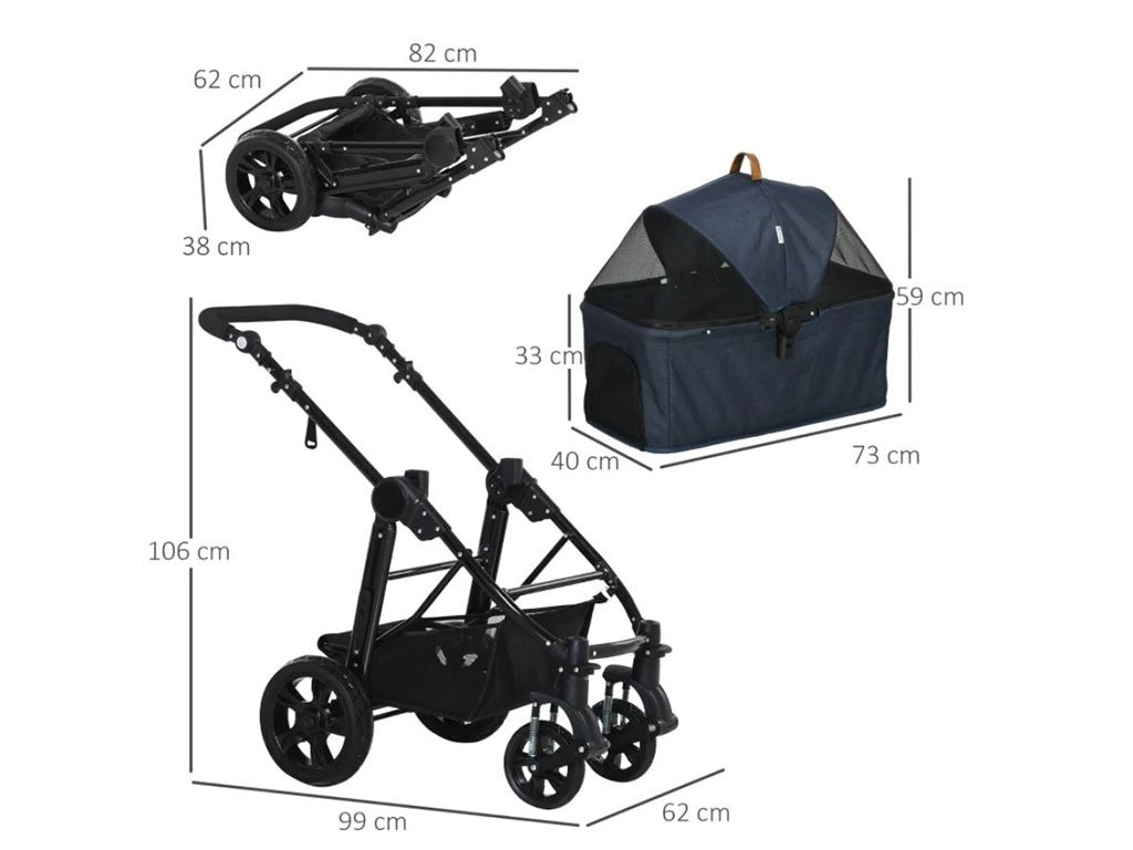 Kočárek 2v1 pro psy do 10kg, také jako přenosná taška, nastavitelné madlo kočárku, ocelový rám, potah z tkaniny Oxford, přední a zadní síťovaná okénka, skládací 4 stupňová stříška, síťovaná dvířka na zip, polstrovaná lehací plocha, uvnitř koše 2 bezpečnostní vodítka, 2 otáčecí přední kola s pružinami, 2 pevná zadní kola s brzdami, rozměry koše s baldachýnem 73x40x59cm, vnitřní rozměry koše 53x36x20cm, celkové rozměry kočárku 99x62x106cm.