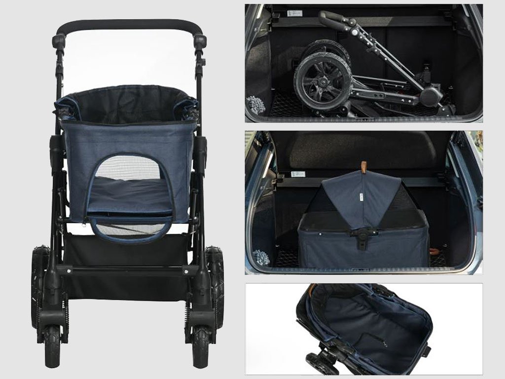 Kočárek je snadno skladovatelný. Během chvilky složíte celý kočárek a můžete jej uschovat, nebo připravit na převoz autem. Korbu z kočárku snadno vyjmete a máte tak přenosnou tašku na psa, zatímco ocelový rám můžete složit. Také samotná korba/taška na psa je skládací. Pokud jenom chcete psovi dopřát během jízdy skvělý výhled, stačí odepnout a otevřít 4stupňovou skládací stříšku.