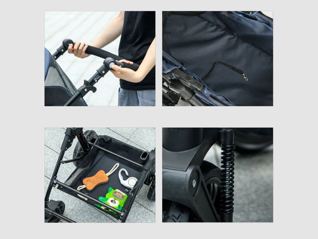 Se 4stupňovou sklápěcí střechou lze psa v kočárku snadno uzavřít a díky síťované přední a zadní straně stříšky má pes nejenom dobrý výhled, ale také přísun čerstvého vzduchu. Stříšku jednoduše zajistíte zapínáním, aby pes nemohl vyskočit a navíc psa můžete připnout na dvě bezpečnostní vodítka uvnitř kočárku. Polstrované dno kočárku nabízí psovi pohodlné ležení během jízdy. Během ležení může pes pozorovat okolí přes síťovaná přední dvířka na zip, která lze otevřít. Kočárek má také dostatek úložného prostoru na výbavu pro psa. Spodní velká kapsa pod korbou kočárku slouží k uložení větších potřeb jako je láhev s vodou, vodítko, deka a další potřeby pro psy.