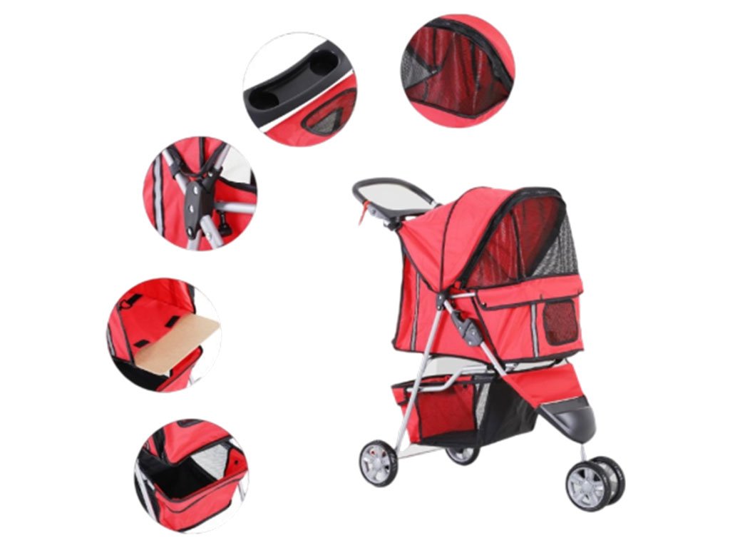 Kočárek pro psy do 10kg, 2 držáky na láhve, ocelový rám, potah z tkaniny Oxford, sklápěcí střecha proti slunci, přední síťovaná dvířka na zip, zadní dvířka s taškou na zip, uvnitř 2 bezpečnostní vodítka, dvojitá otáčecí přední kola, 2 dvojitá pevná zadní kola s brzdami, vnitřní rozměry s baldachýnem 55x32x52cm, celkové rozměry kočárku 75x45x97cm.
