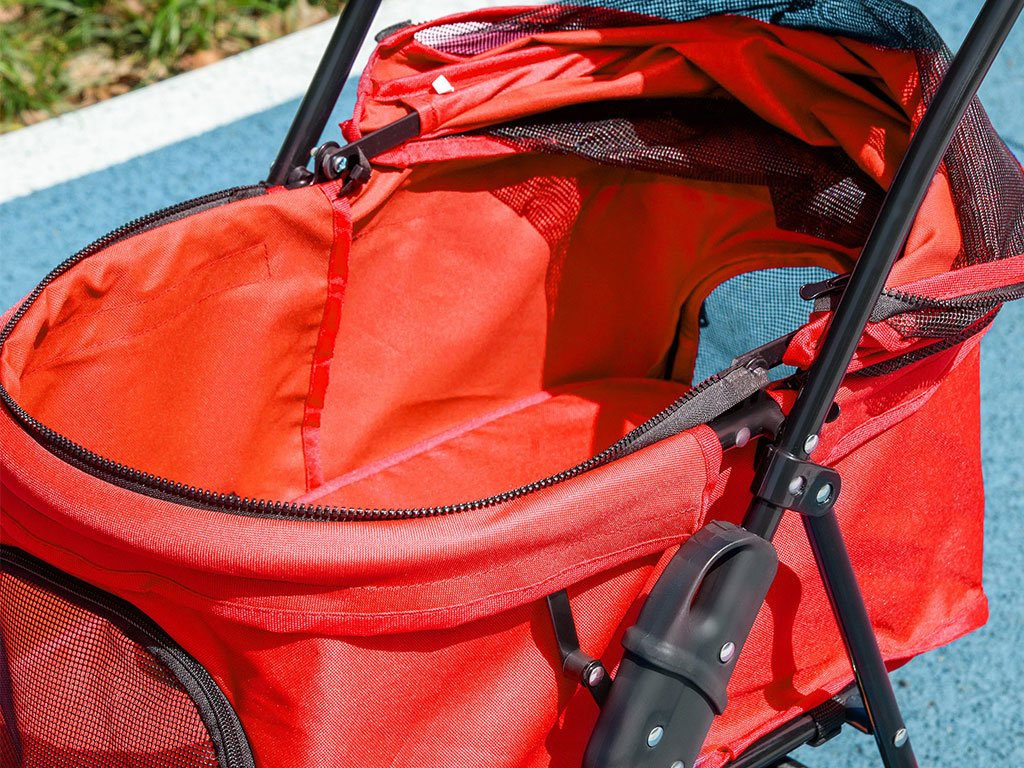 Se sklápěcí střechou proti slunci lze psa v kočárku snadno uzavřít a díky velkému síťovanému oknu v stříšce a síťovaným dvířkám má pes nejenom dobrý výhled, ale také přísun čerstvého vzduchu. Manipulace se psem bude přes přední a zadní rozepínací dvířka na zip snadná a psa následně můžete připnout na dvě bezpečnostní vodítka uvnitř kočárku. Kočárek má také dostatek úložného prostoru na výbavu pro psa. Spodní velká kapsa pod korbou kočárku slouží k uložení větších potřeb jako je láhev s vodou, vodítko, deka a další potřeby pro psy. Praktická kapsa na zip na zadních dvířkách je umístěná hned po ruce pro drobné potřeby jako jsou pamlsky, nebo doklady.