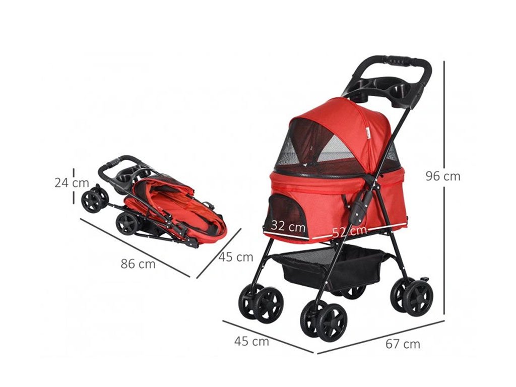 Kočárek pro psy do 4kg, 2 držáky na láhve, ocelový rám, potah z tkaniny Oxford, sklápěcí střecha proti slunci, přední síťovaná dvířka na zip, zadní dvířka s taškou na zip, uvnitř 2 bezpečnostní vodítka, dvojitá otáčecí přední kola, 2 dvojitá pevná zadní kola s brzdami, vnitřní rozměry s baldachýnem 52x32x48cm, celkové rozměry kočárku 67x45x96cm.