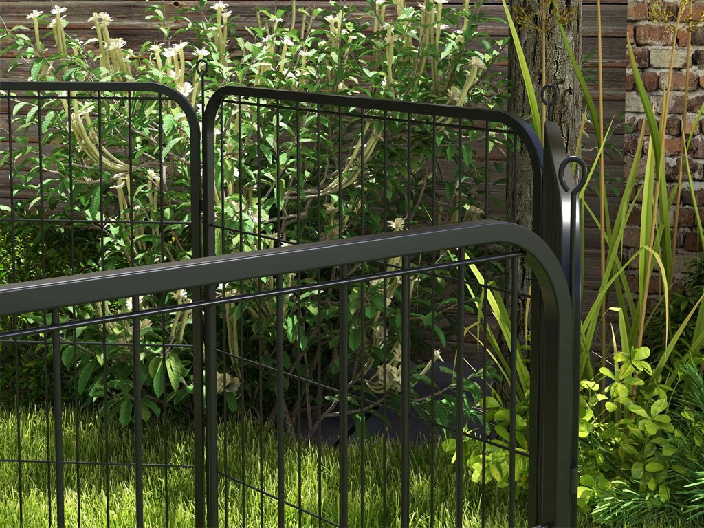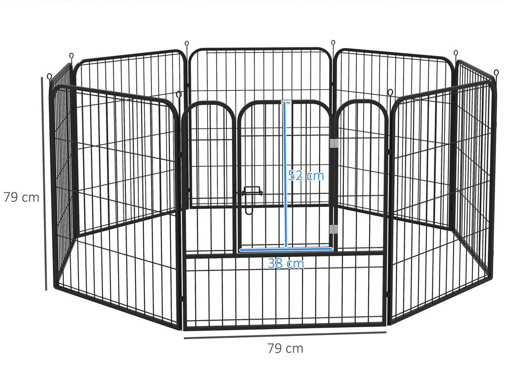Ohrádka pro štěňata a další zvířata, pro vnitřní i venkovní využití, vyvýšená uzamykatelná dvířka, stabilní robustní konstrukce, snadná montáž a demontáž, 8 mřížových panelů o rozměrech 79x79 cm.