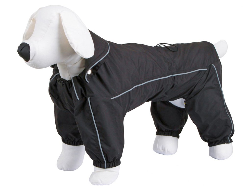 Pláštěnka pro psy, odolnost proti dešti a větru, se stahovací šňůrkou pro uchycení, odnímatelný límec, ochrana až ke každé tlapce, s reflexním lemováním, obvod krku 36 cm, obvod břicha 40 cm, délka těla 30 cm, délka nohou 23 cm.