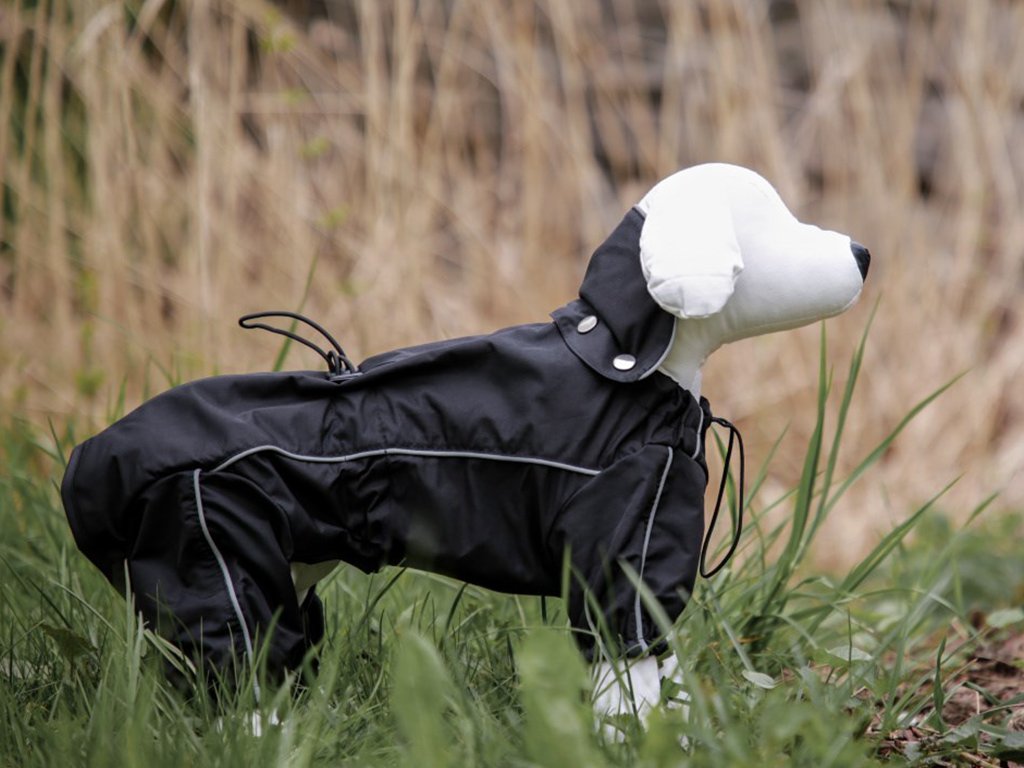 Pláštěnka pro psy, odolnost proti dešti a větru, se stahovací šňůrkou pro uchycení, odnímatelný límec, ochrana až ke každé tlapce, s reflexním lemováním, obvod krku 36 cm, obvod břicha 40 cm, délka těla 30 cm, délka nohou 23 cm.