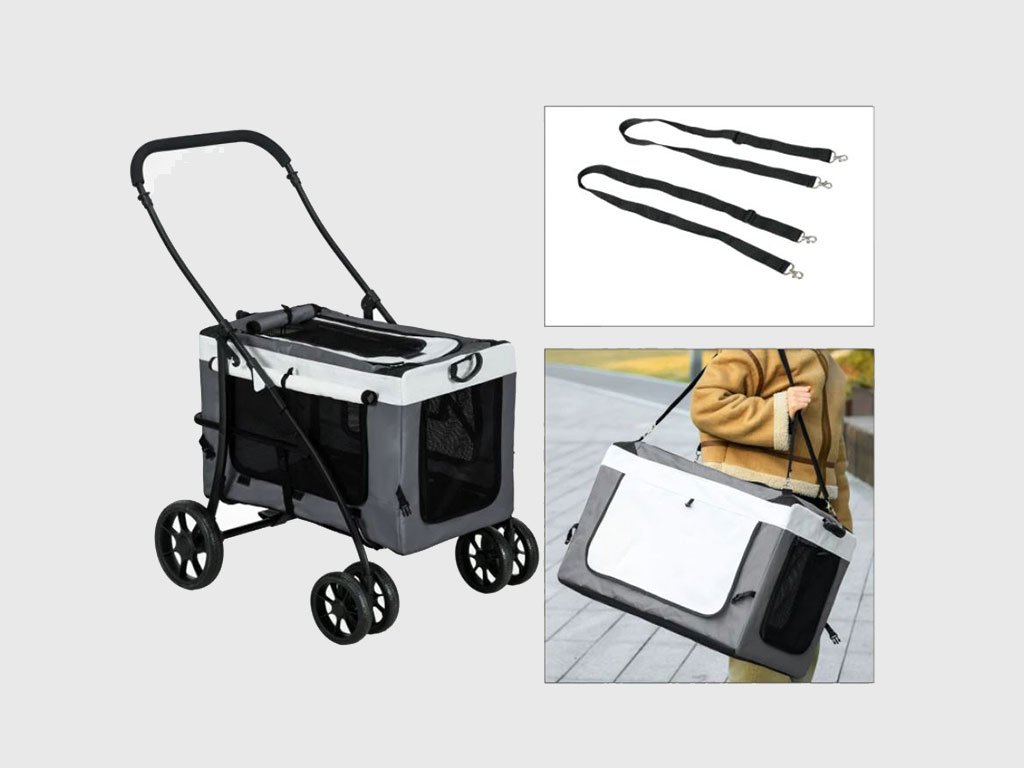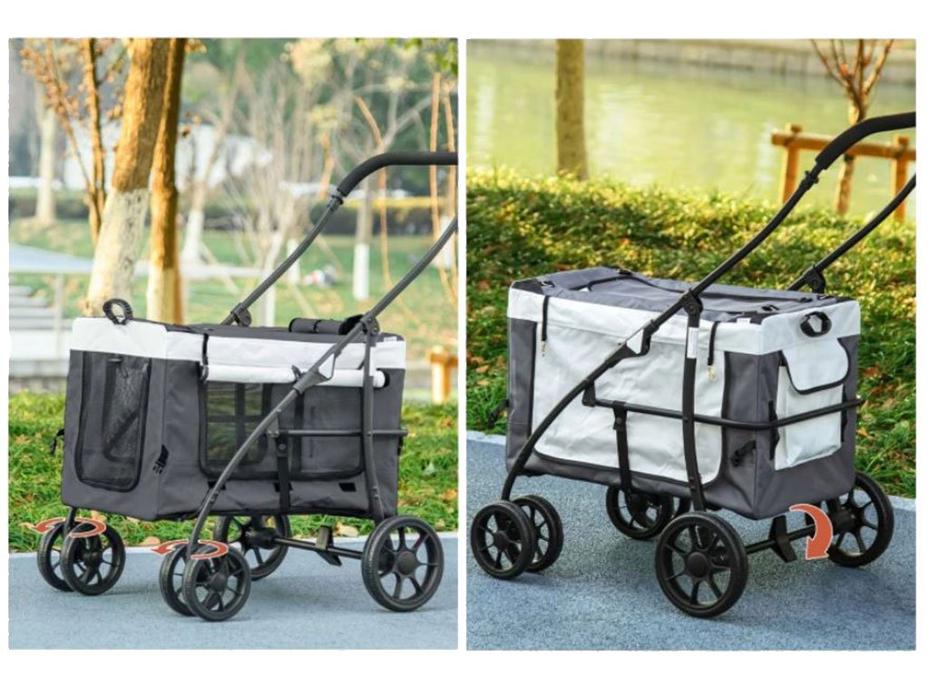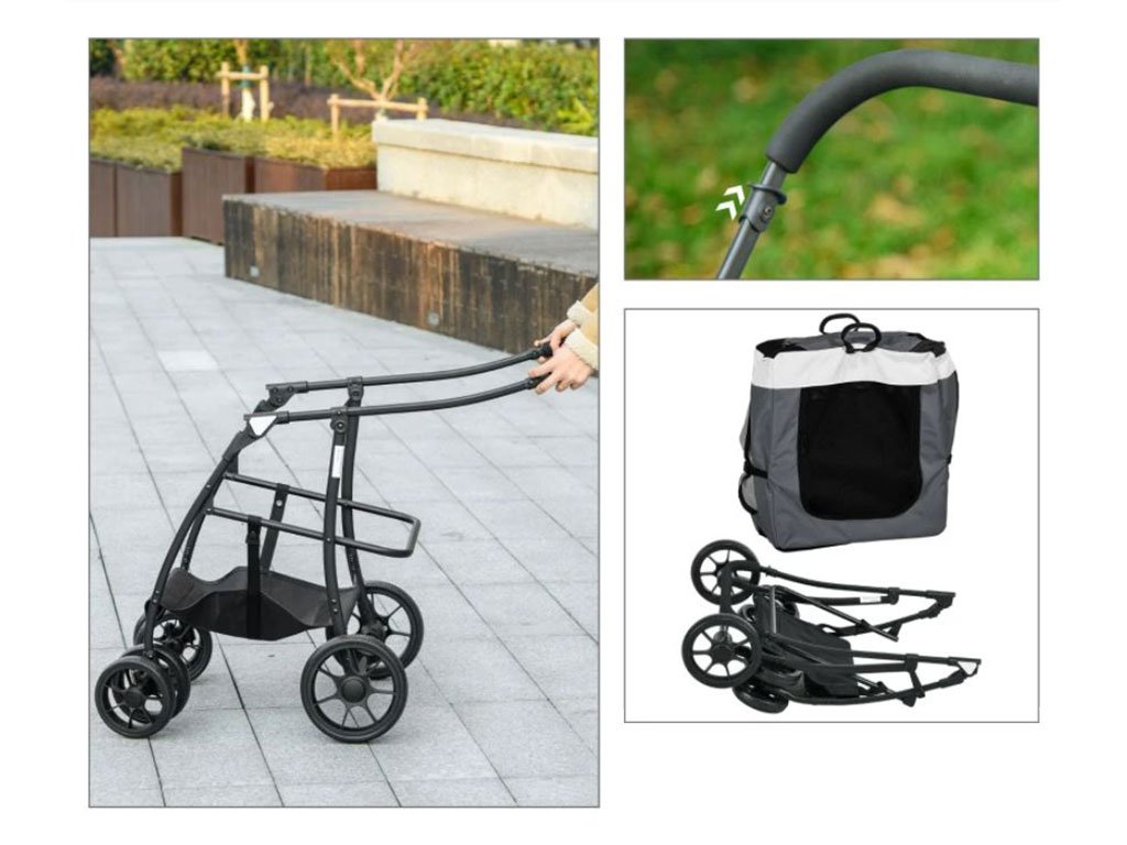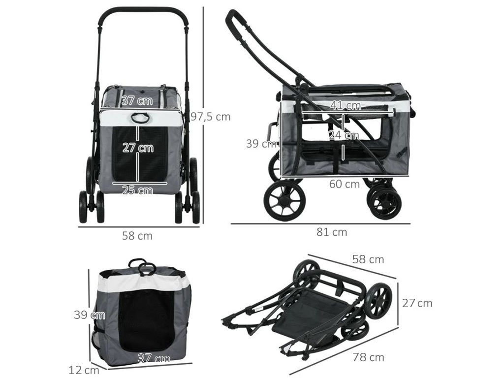 Vozík 2v1 pro psy do 10kg, také jako přenosná taška, ocelový rám, potah z tkaniny Oxford, horní okénko ze síťoviny na zip, síťovaná přední a boční dvířka na zip, pohodlné polstrování k ležení, 2 madla a 2 popruhy k nošení, úložná kapsa na zadní straně, uvnitř bezpečnostní vodítko, 2 dvojitá otáčecí přední kola EVA, 2 otočná zadní kola s brzdou, rozměry tašky 60x37x39cm, celkové rozměry vozíku 81x58x97,5cm.