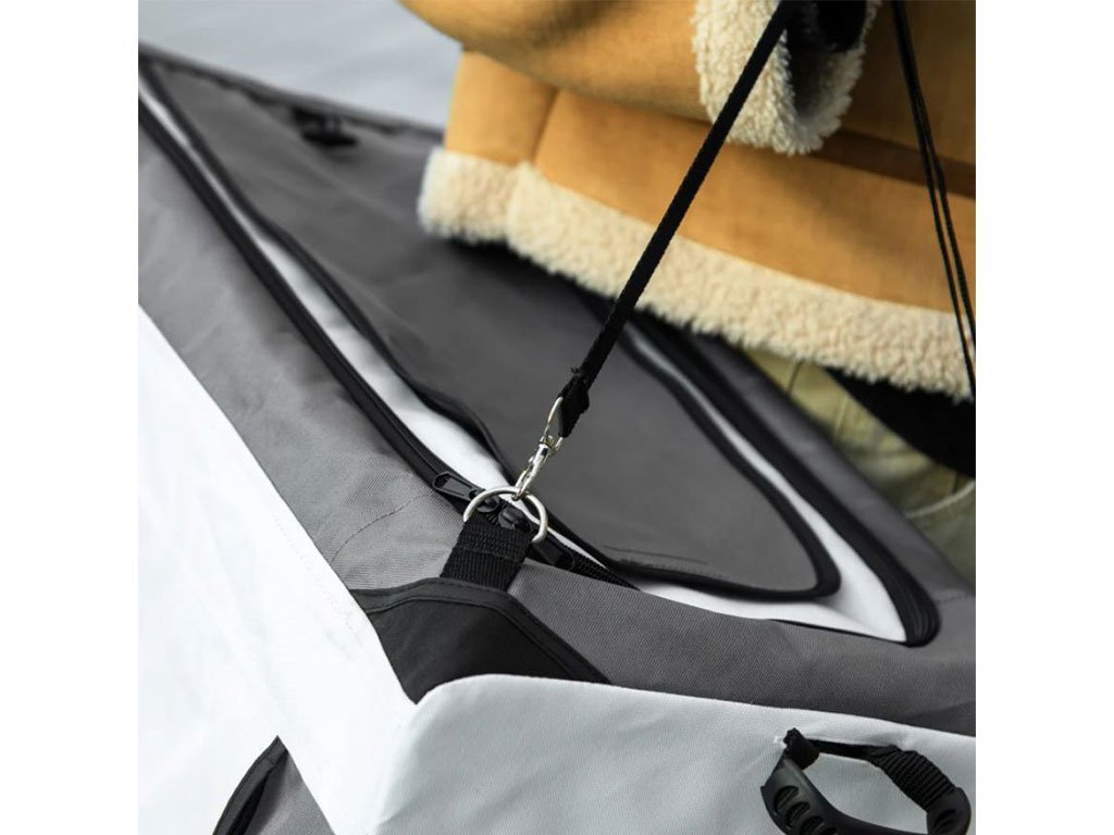 Se síťovanými předními dvířky a bočními dvířky na zip lze psa ve vozíku snadno uzavřít a pes má nejenom dobrý výhled, ale také přísun čerstvého vzduchu. Když chcete psovi dopřát slunce, dobře poslouží síťované střešní okénko na zip. Když bude větrno nebo deštivo, přes střešní i boční okna můžete srolovat ochranné plachty na suchý zip. Měkké polstrování na dně vozíku nabízí psovi pohodlné ležení během jízdy. Vozík má také dostatek úložného prostoru na výbavu pro psa. Zadní kapsa slouží k uložení potřeb jako je láhev s vodou, vodítko, pamlsky a další potřeby pro psy. Při nošení tašky oceníte 2 madla a 2 nastavitelné odepínací popruhy, které lze snadno přizpůsobit výšce člověka.