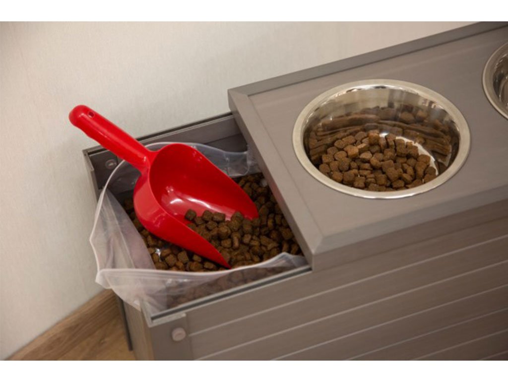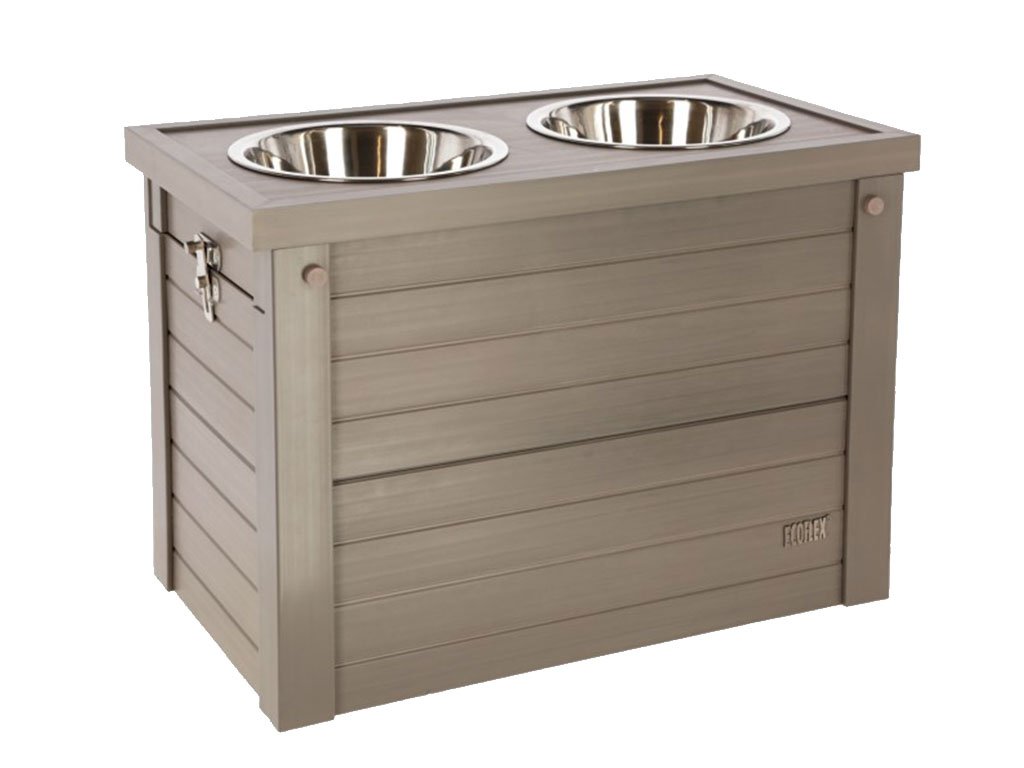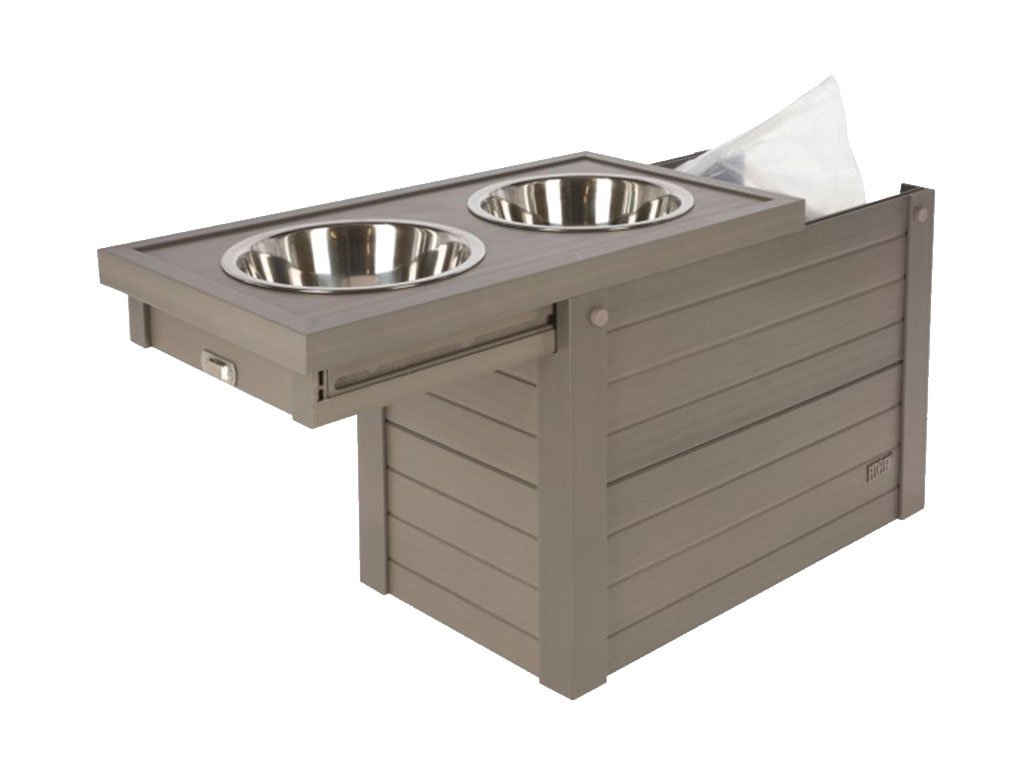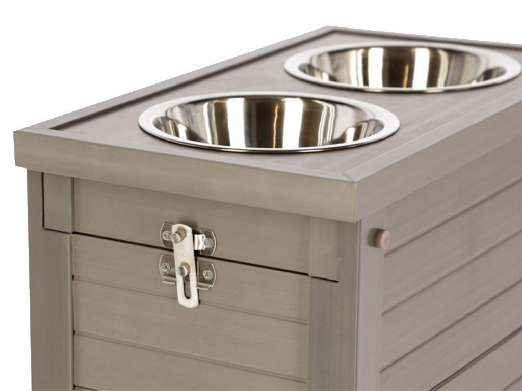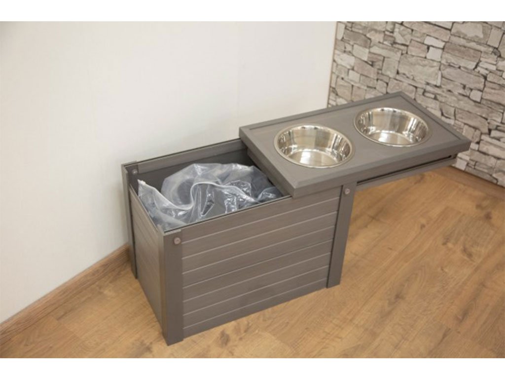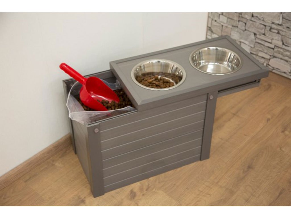 Komplet obsahuje dvě odolné nerezové misky, každá o objemu 1200 ml. Zásobník o rozměru 54x30x39,5 cm obsahuje vysouvací stojan na misky, zámek a úložný prostor o rozměru 48x26x26 cm. V úložném prostoru se nachází vzduchotěsný vak na granule o objemu 30 litrů. Zásobník je vyrobený z EKO plastu, který je odolný vůči vlivům počasí, vůči UV záření a vodě. EKO plast také nepohlcuje žádné pachy a díky svému složení (60%plast, 40% dřevo), je také téměř nehořlavý a nepodléhá hnilobě.